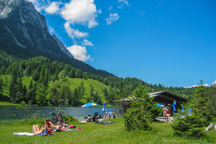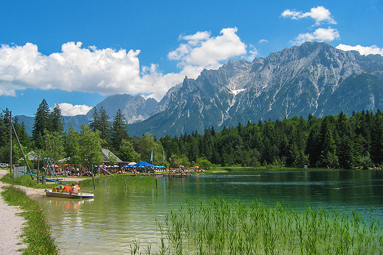 Blick auf Badeanstalt am Lautersee und Karwendelgebirge