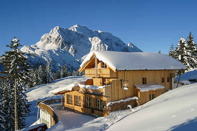 Kranzberggipfelhaus im Winter mit Blick auf Wetterstein